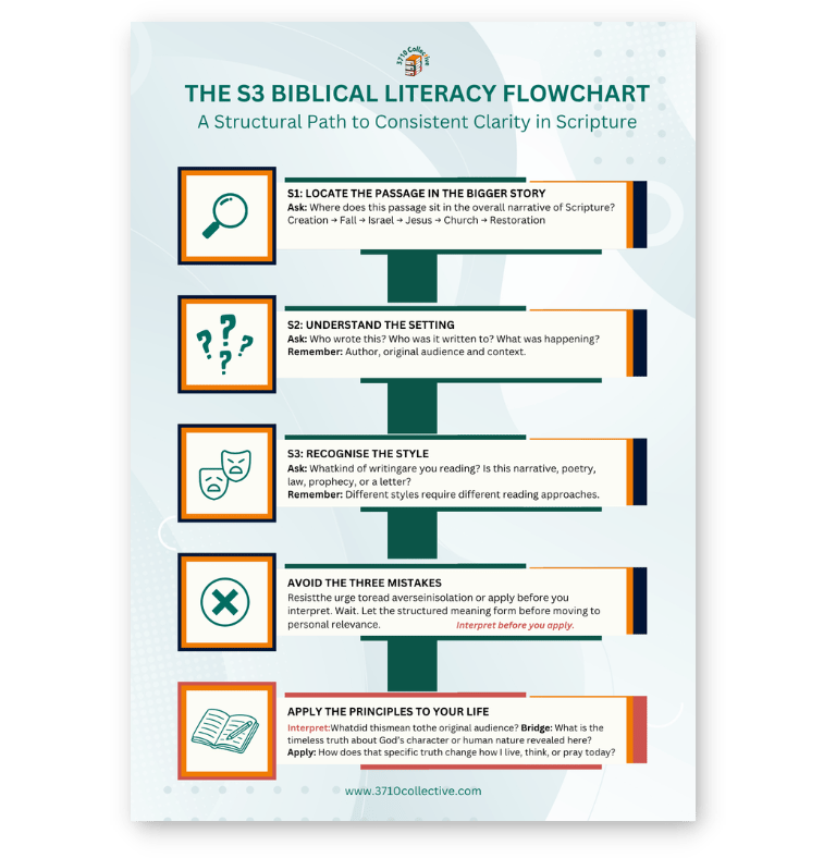 Every week, 3710 Collective publishes a short teaching that takes one passage of Scripture and walks through it using the S3 Framework. Its how the method becomes a habit. You'll start receiving it automatically after downloading the Starter Kit.